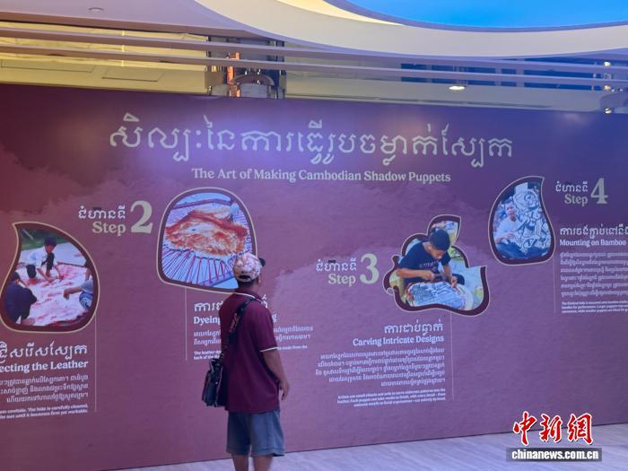 當(dāng)?shù)貢r間11月25日,《時光之影》皮影特展在金邊展出多件柬埔寨傳統(tǒng)皮影作品。圖為一名觀眾在觀看柬埔寨大皮影制作工藝展示墻?!妼殐x 攝