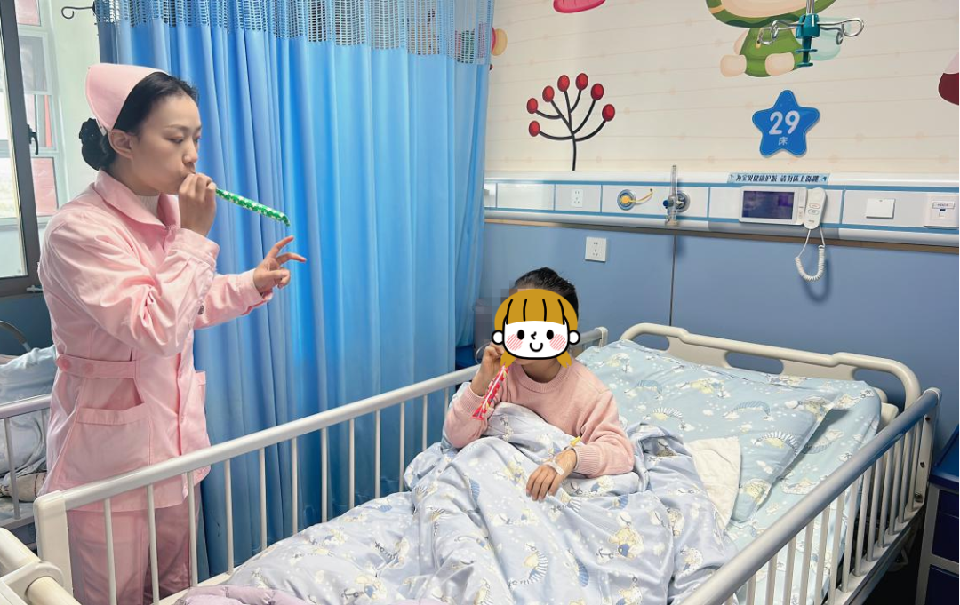 “來,一二三吸氣,一二三呼氣,慢慢吹……”胡祎夢一邊溫柔地喊著口令,一邊用彩色長管做著示范。這并非簡單的游戲互動,而是針對患兒設(shè)計的主動呼吸循環(huán)技術(shù)趣味教學(xué)——將專業(yè)的康復(fù)訓(xùn)練轉(zhuǎn)化為“吹吸管挑戰(zhàn)”,讓小朋友在輕松的氛圍中自然掌握呼吸節(jié)奏控制技巧。這種寓教于樂的方式,不僅有效鍛煉了患兒的呼吸肌功能、助力痰液排出,更成功驅(qū)散了疾病治療帶來的枯燥與焦慮,讓病房里的康復(fù)訓(xùn)練充滿歡聲笑語。