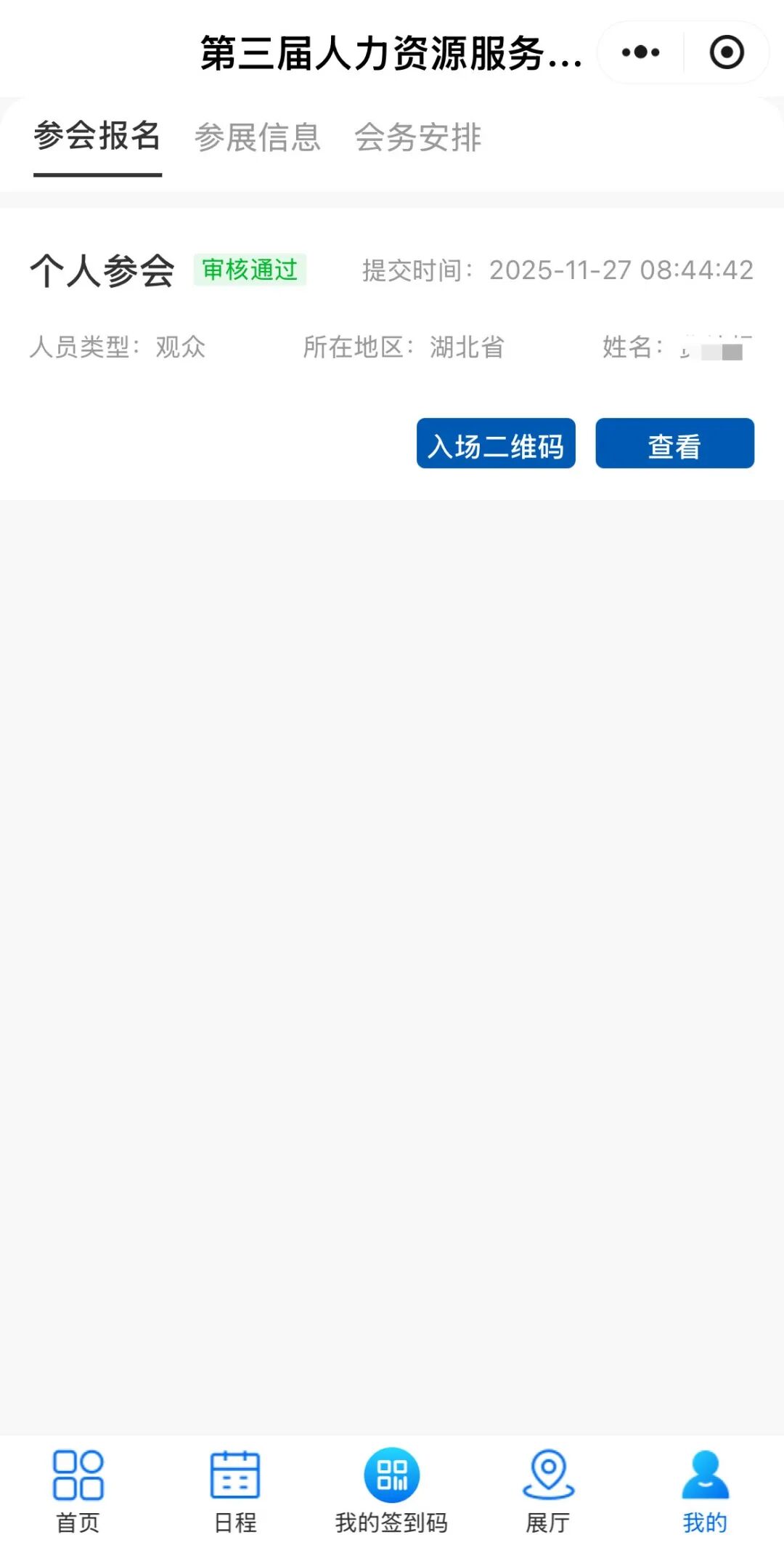 2.填寫報名信息。依次輸入人員類型、姓名、性別等內(nèi)容后,點擊提交按鈕,即可報名成功,報名成功后,可在“我的簽到碼”中查看入場二維碼及報名信息。
