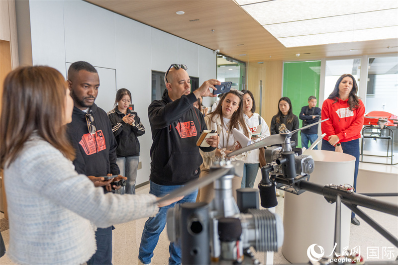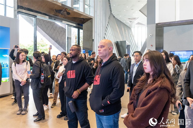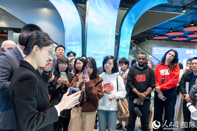 記者團(tuán)在前海5號(hào)樓參觀科技創(chuàng)新產(chǎn)品的展示并聽(tīng)取講解。人民網(wǎng)記者 許崢攝