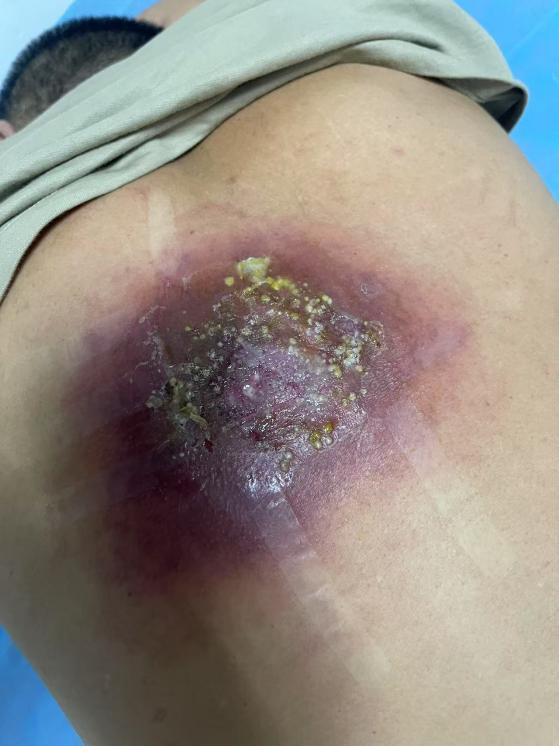 2025年10月,在三亞務(wù)工的王先生背部突然出現(xiàn)包塊,隨即發(fā)展為紅腫破潰,伴隨劇烈疼痛。盡管在當?shù)蒯t(yī)院接受了12天治療,病情卻持續(xù)惡化:創(chuàng)面不斷擴大,還出現(xiàn)全身乏力、精神萎靡等癥狀。意識到情況危急,他毅然決定轉(zhuǎn)回家鄉(xiāng)孝感市中心醫(yī)院尋求治療。