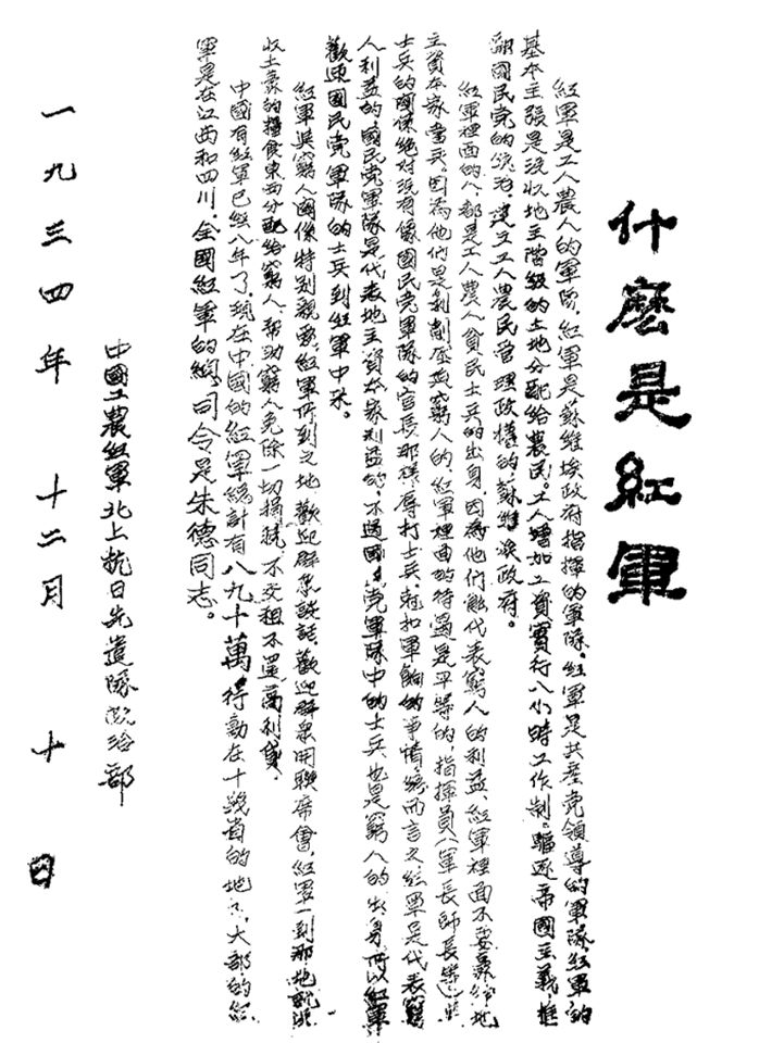 在長征途中,紅二十五軍于1934年至1935年間創(chuàng)建了鄂豫陜革命根據(jù)地,這也是紅軍長征途中唯一建立的根據(jù)地。在這里,紅二十五軍著手宣傳黨和紅軍的政策,播撒革命火種,《什么是紅軍》宣傳單就是在當(dāng)時(shí)印發(fā)的。